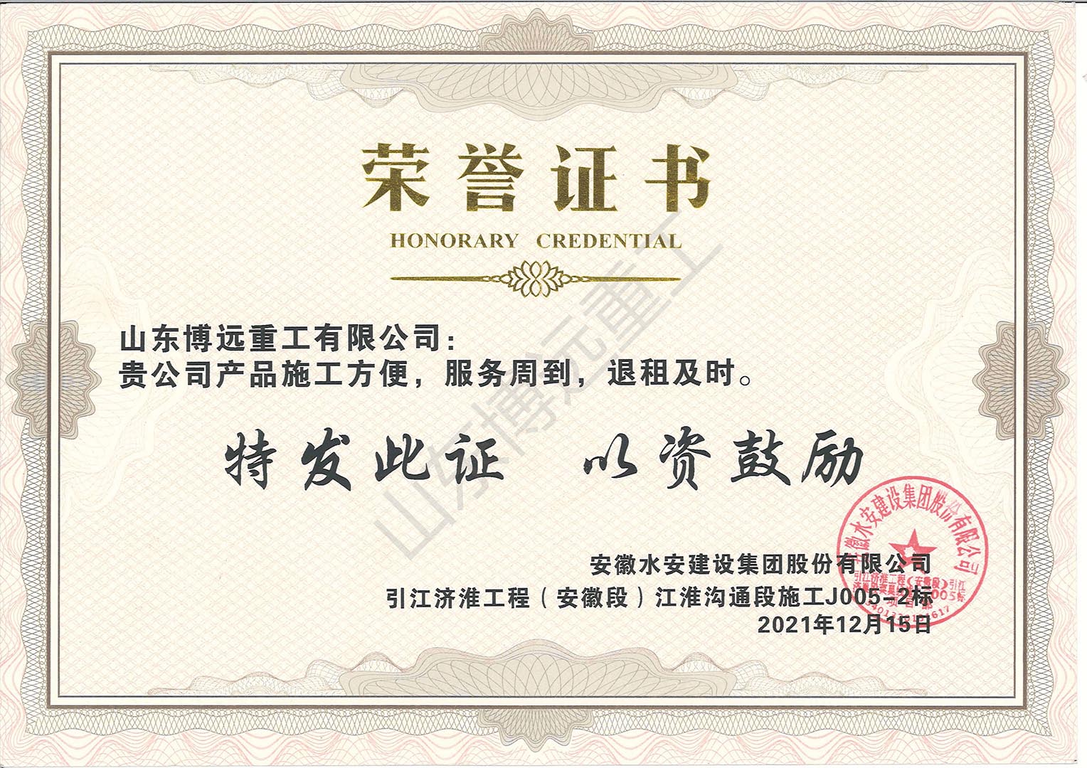 安徽水安建設(shè)集團引江淮工程(安徽段)江淮溝通段榮譽證書