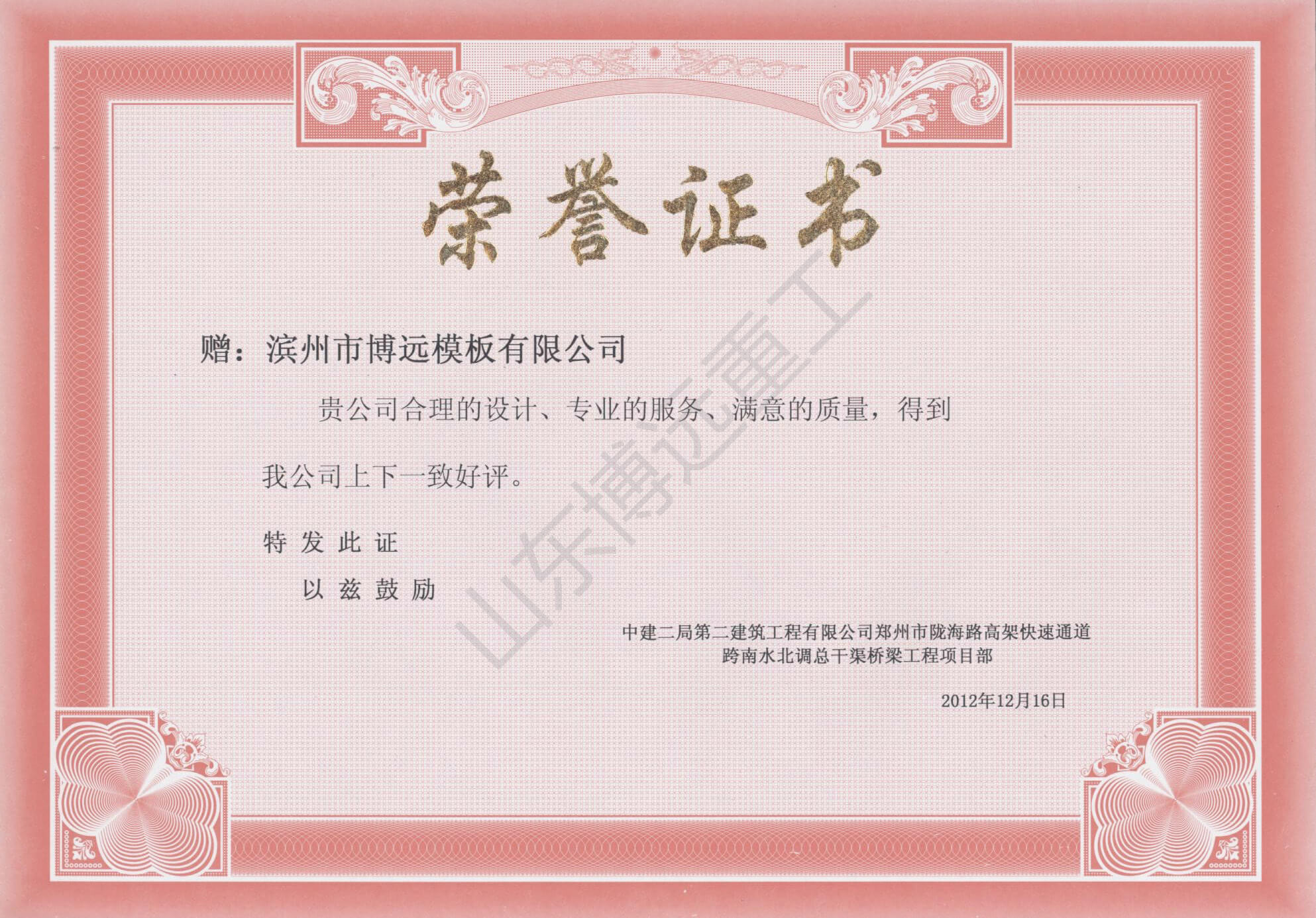 中國建筑陸埠互通項目榮譽證書