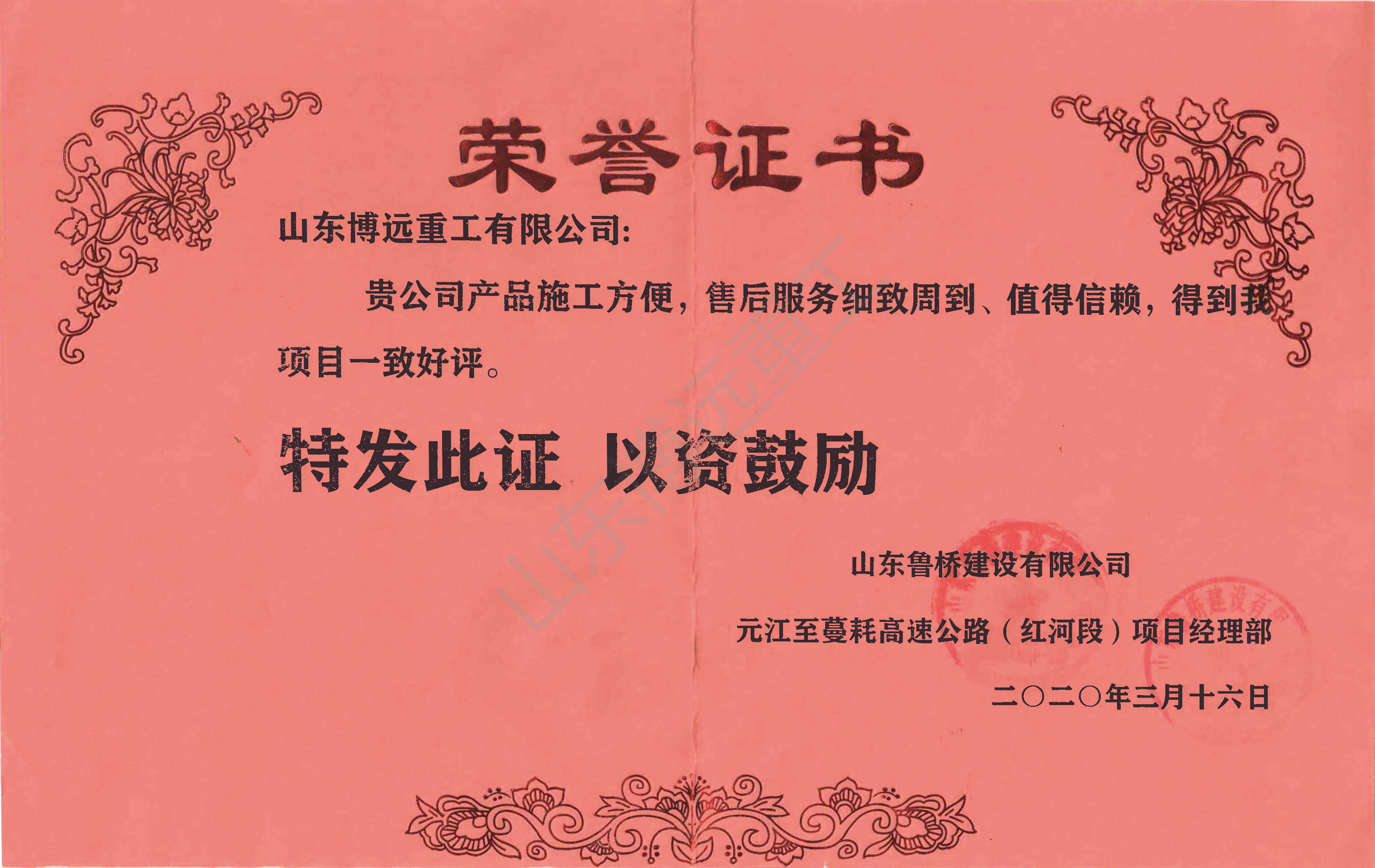 中交二航局南沿江項目榮譽證書