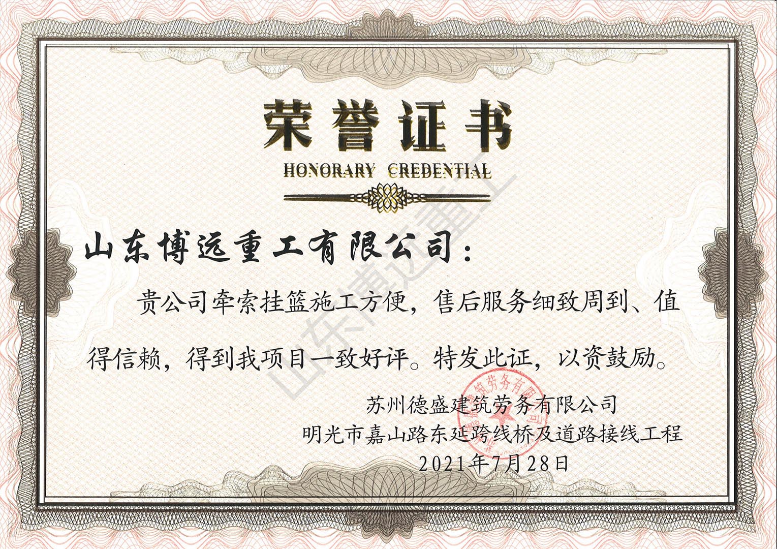 明光市嘉山路東延跨線橋及道路接線工程牽索掛籃榮譽證書